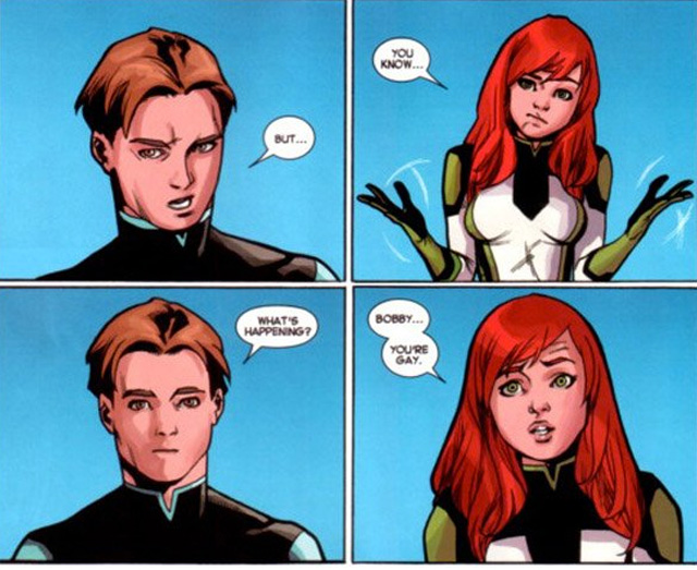 The current storyline, written by Brian Michael Bendis, follows young versions of the original five X-Men (Iceman, Cyclops, Beast, Angel, and Jean Grey) displaced in time and fighting the never-ending battle in present day. The reveal of Ice Man’s sexuality – long speculated by fans – unfolds in a scene where Jean Grey calls the frosty mutant out for hiding who he is by overcompensating with flirtatious comments aimed at his female teammates. When he denies it, she reminds him she’s a psychic and can read his mind, before he finally lets his guard down and admits he’s got a thing for one of his fellow male mutants.