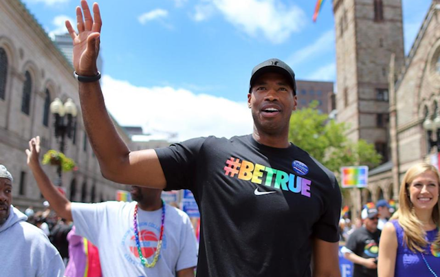 Gay NBA player Jason Collins marched in Boston’s Pride Parade yesterday. According to Sports Illustrated, Collins, who came out as gay in April, made a promise in that initial interview. Speaking of his former roommate, Joe Kennedy, Collins reflected that when he’s heard Joe had marched int he Boston Pride Parade in 2012, he had been jealous. “was proud of him for participating but angry that as a closeted gay man I couldn’t even cheer my straight friend on as a spectator” for fear of being outed. But things changed after the Boston Marathon bombing. Collins said: